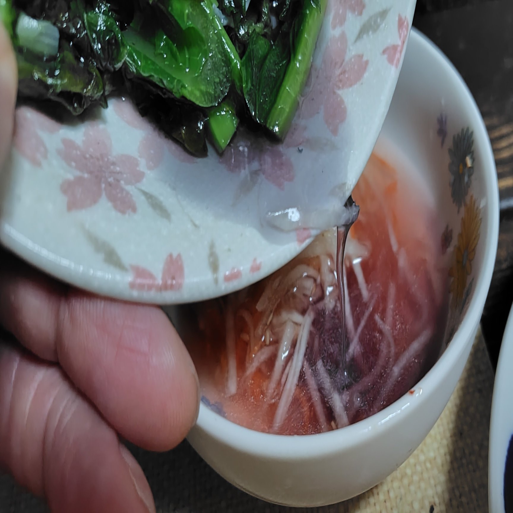 ・・・と言いたいところですが、実際には青い汁を恐れた妻の手によって何度も洗い流され、からし菜特有の刺激はどこかに行ってしまいました